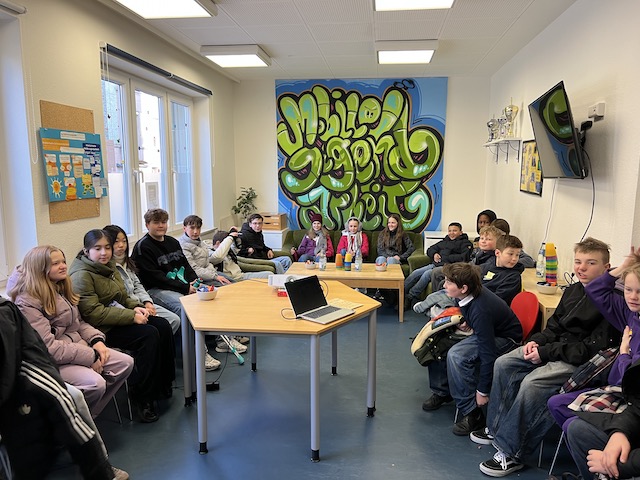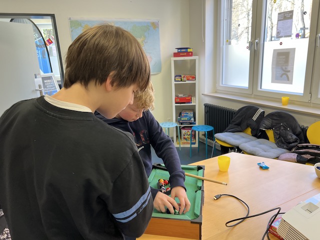 Am heutigen Freitag (20.3.) hat Schulsozialarbeiterin Lea die 7a und 7c in ihre Räumlichkeiten am Bismarckturm eingeladen. "Ecke 28" nennt sich das Büro der Mobilen Jugendarbeit. Hier konnten unsere Schüler nicht nur erfahren, wie die Mitarbeiter dort ihnen beratend zur Seite stehen können, sondern konnten sich auch vom Spielangebot überzeugen. Dass die Mobile Jugendarbeit auch ein Nachtfußball-Turnier anbietet und es am Freitag vor den Ferien eine "School's Out"-Party mit Hot Dogs gibt, wusste niemand und das Angebot wurde interessiert aufgenommen. Vielen Dank an Lea und Leonie von der MJA, die uns sympathisch empfangen haben!