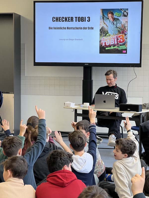 Gregor Eisenbeiß schreibt die Bücher der beliebten „Checker Tobi“-Reihe und stattete dem Ebelu am Donnerstag (29.1.) einen Besuch ab. Für die Jüngsten aus der Schulgemeinschaft las er aus der Vorlage für den aktuellen Kinofilm „Checker Tobi 3 – Die heimliche Herrscherin der Erde“. Nebenbei erfuhren unsere Fünfer, wie die Buchvorlage sich manchmal vom Drehbuch unterscheidet oder wie manche Szenen des Films gedreht wurden und es wurden viele Fragen beantwortet. Auch ein Wissensquiz durfte nicht fehlen und als Belohnung für besonders cleveren Quizzer gab es ein Checker Tobi – Autogramm.