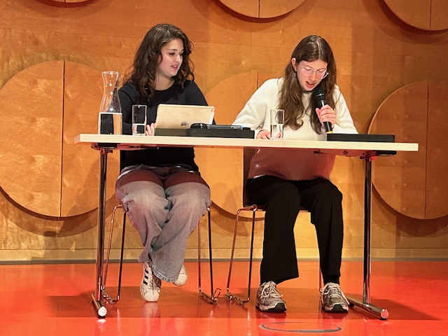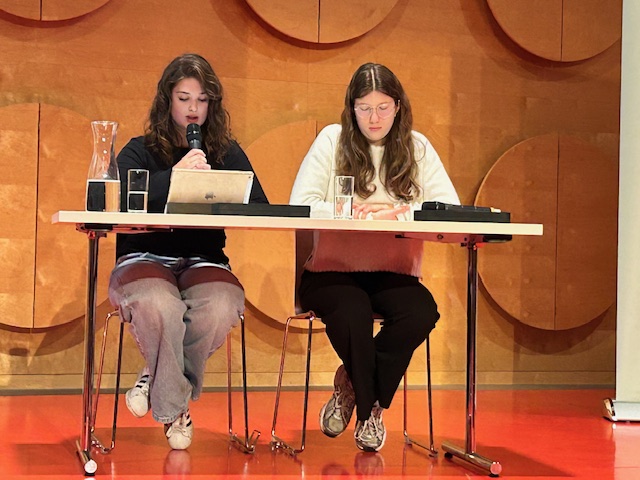 Unsere Schülerinnen Naomih Hadzic und Sofia Wittorf (beide KS2) lasen dabei autobiographische Zeugnisse Hannah Arendts vor, wodurch das Publikum einen sehr authentischen Eindruck über das Denken und Fühlen der Philosophin gewinnen konnte.
