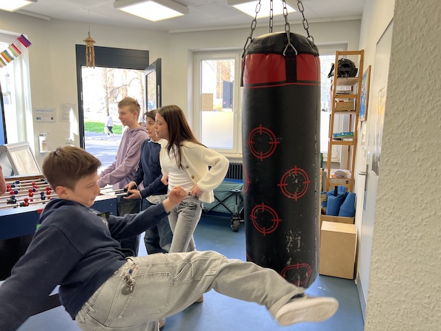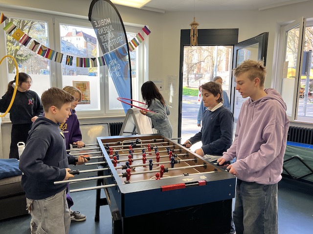 Am heutigen Freitag (20.3.) hat Schulsozialarbeiterin Lea die 7a und 7c in ihre Räumlichkeiten am Bismarckturm eingeladen. "Ecke 28" nennt sich das Büro der Mobilen Jugendarbeit. Hier konnten unsere Schüler nicht nur erfahren, wie die Mitarbeiter dort ihnen beratend zur Seite stehen können, sondern konnten sich auch vom Spielangebot überzeugen. Dass die Mobile Jugendarbeit auch ein Nachtfußball-Turnier anbietet und es am Freitag vor den Ferien eine "School's Out"-Party mit Hot Dogs gibt, wusste niemand und das Angebot wurde interessiert aufgenommen. Vielen Dank an Lea und Leonie von der MJA, die uns sympathisch empfangen haben!